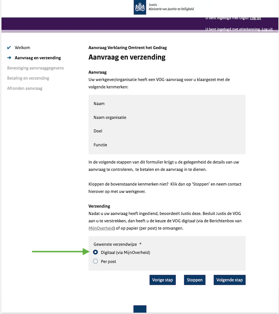 Stap 5: Vraag jouw nieuwe VOG aan via de link in de mail die je vanuit Justis hebt ontvangen. Kies bij gewenste verzendwijze voor digitaal.